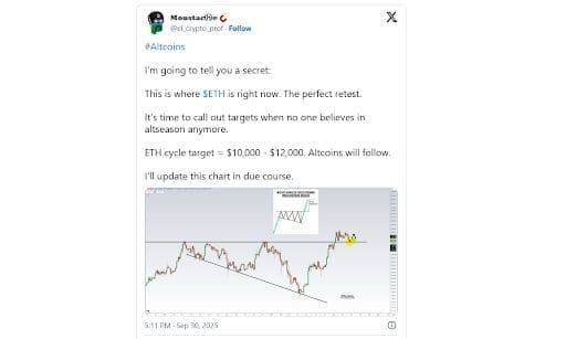 <blockquote class=”twitter-tweet”><p lang=”en” dir=”ltr”><a href=”https://twitter.com/hashtag/Altcoins?src=hash&ref_src=twsrc%5Etfw”>#Altcoins</a> <br><br>I'm going to tell you a secret:<br><br>This is where <a href=”https://twitter.com/search?q=%24ETH&src=ctag&ref_src=twsrc%5Etfw”>$ETH</a> is right now. The perfect retest.<br><br>It's time to call out targets when no one believes in altseason anymore.<br><br>ETH cycle target = $10,000 – $12,000. Altcoins will follow.<br><br>I'll update this chart in due course. <a href=”https://t.co/0UKUaYYstE”>pic.twitter.com/0UKUaYYstE</a></p>— 𝕄𝕠𝕦𝕤𝕥𝕒𝕔ⓗ𝕖 🧲 (@el_crypto_prof) <a href=”https://twitter.com/el_crypto_prof/status/1973058063624998926?ref_src=twsrc%5Etfw”>September 30, 2025</a></blockquote> <script async src=”https://platform.twitter.com/widgets.js” charset=”utf-8″></script>