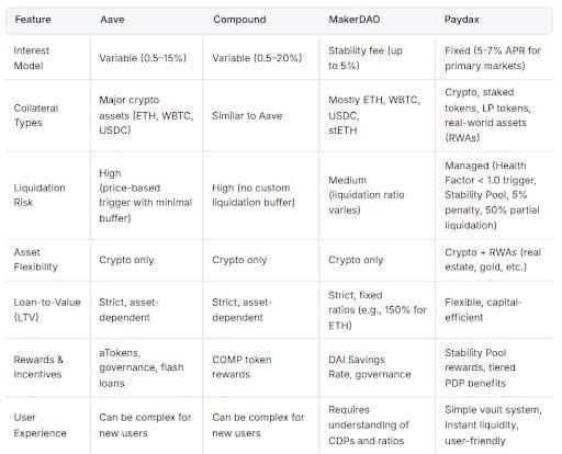 Paydax Protocol (PDP) distinguishes itself from other DeFi platforms, such as Aave, Compound, and MakerDAO, due to its innovative features. These include:
