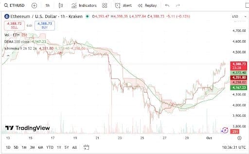 Ethereum has maintained momentum, supported by its vast ecosystem of decentralized applications and scaling solutions. The Ethereum Price Prediction for 2025 is influenced by Ethereum’s role in smart contracts, NFTs, and the broader DeFi project landscape. At present, ETH trades around $4,389.00, up 2.12% in the past day, with a market cap of $529.76 billion and daily trading volume of $48.04 billion, reflecting rising institutional confidence.