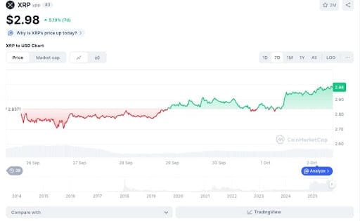 Ripple is over 5% up on the seven-day charts, and the token price is approaching the breakout mark. The XRP price is around $2.98, and a break above $3 will see Ripple enter another bullish cycle.