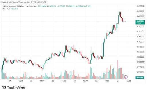 Today, XLM is trading around $0.40. The price is pressing against the upper boundary of a wedge pattern spanning $0.39–$0.40. Many view this as a breakout point that could spark a massive surge.