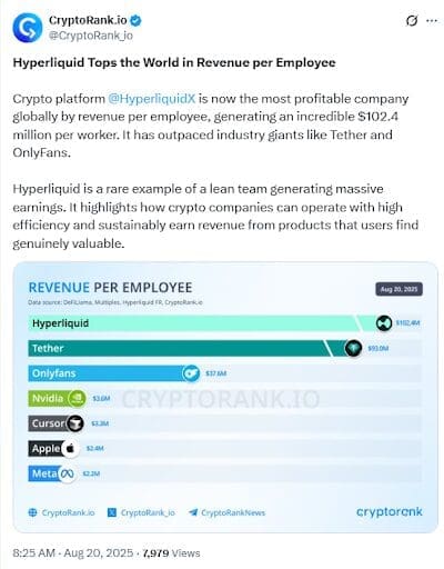 Despite having no major marketing push and just 11 employees, Hyperliquid boasts the record for the highest revenue per employee at around $105 million.