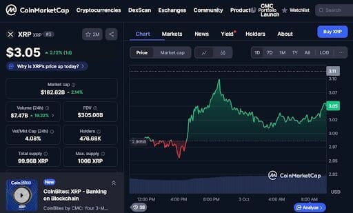 XRP live price, market cap, and 24h volume snapshot. Source: CoinMarketCap