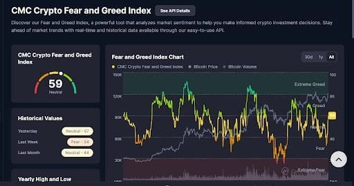 The CMC Crypto Fear and Greed Index has reached a neutral mark; thus, investor sentiment in the crypto market is cautiously optimistic. This increase is an indication of the recovery from the level of fear at 34 last week. The movement indicates a decline in volatility and renewed investor confidence, with Bitcoin stabilizing above major psychological levels.