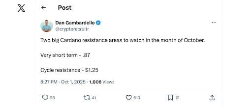 Cardano (ADA) is trading close to the $0.87 mark as analysts watch October with optimism. Dan Gambardello, a well-known ADA bull, flagged this price zone as a short-term barrier that could unlock further gains if flipped. He also pointed to the $1.25 level as what he calls the “bull market door.”