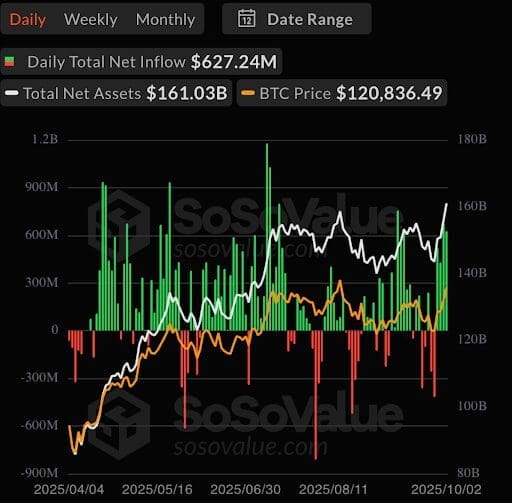 Bitcoin has started October on a strong note. BTC price broke above $120,000 on October 2, reaching its highest level since mid-August. After a brief dip near $114,000 at the start of the month, BTC quickly rebounded to $119,000 and even touched $121,044. Analysts point to “Uptober” optimism and the steady ETF inflows as the main drivers.