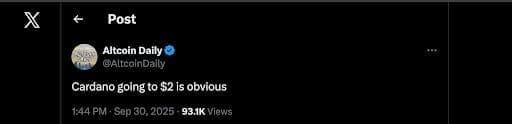 Influencer Austin Arnold from Altcoin Daily has publicly called a $2 ADA price “obvious”. At the same time, others, including AI prediction model Deepseek, have shared higher targets near $7.