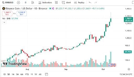 Meanwhile, BNB trades at $1,268.9, recording a 4.62% daily rise. With a market cap of $176.87 billion and a trading volume of $9.31 billion, up 80.54%, the token continues to benefit from growing adoption across centralized and decentralized exchanges.
