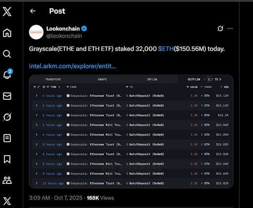 Blockchain data from Lookonchain shows Grayscale staked 32,000 ETH worth $150 million, marking one of its largest single staking moves this year.