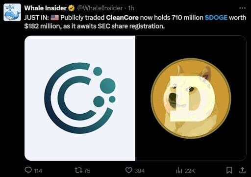 In the meantime, renewed institutional accumulation is being witnessed in the ecosystem of Dogecoin. CleanCore Solutions disclosed that it currently possesses 710 million DOGE, comprising 20 million in unrealized gains, as part of its continual strategy to achieve a billion coins. The company affirmed that its holdings have the support of Bitstamp and the House of Doge, focusing on long-term network development and governance.