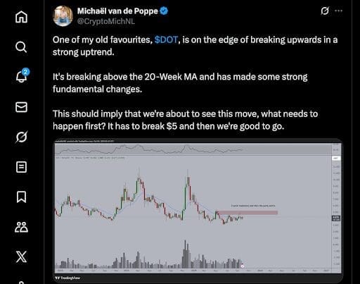 Polkadot trades near $4.17 and has shown quiet accumulation in recent months. Analysts such as Michaël van de Poppe note that DOT needs to clear the $5 mark to confirm a stronger move.