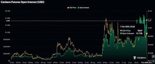 Meanwhile, CoinGlass data on derivatives indicate that open interest increased by 5%, which marks a resurgence of retail traders. ADA is now trading around $0.87, and the price is consolidating within a symmetrical triangle. A firm close above the $0.9182 Fibonacci may open the path to a target of $1.01 and $1.15.
