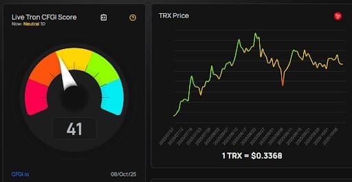 The TRON price is currently $0.337, reflecting a minor drop of approximately 0.23%. Currently, it has a market capitalisation of nearly $29.3 billion and a 24-hour trading volume of roughly $963 million. Over the past year, TRON has reached a high of $0.44068 and a low of $0.15573. Market sentiment for TRON is moderately bullish. Furthermore, technical indicators show that Bullish sentiment is neutral at 69%.