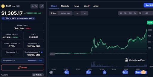 It may not be as volatile as smaller-cap tokens, but it remains one of the few large caps with both liquidity and clear utility. For investors who prefer less speculation but strong upside, BNB remains a key strategic asset. The issue is that it’s presently trading at a major all-time high above $1,300, displacing USDT by market cap, and sitting in third overall.
