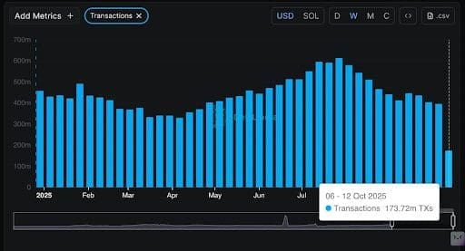 Solana’s on-chain data reveals fewer transactions on its network. Weekly transaction numbers have fallen from over 613 million in July to around 173 million this week. That slowdown suggests traders are waiting for a clearer market direction before committing larger positions.