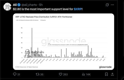 XRP’s most robust support level is $2.80. Glassnode data indicates that around 2.48 billion XRP were bought around this level. Large buying between $2.60 and $2.95 reinforces $2.80 as a critical support level.