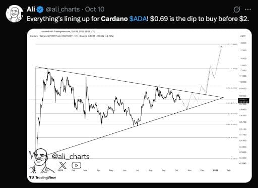 Crypto analyst Ali Martinez recently shared a technical analysis chart showing that “Everything’s lining up for Cardano (ADA),” calling the $0.69 level “the dip to buy before $2.” The analysis, which spans a 12-hour candlestick chart, highlights ADA’s price action consolidating within a massive symmetrical triangle pattern that has been forming for nearly a year. This pattern suggests a period of narrowing volatility is nearing its end, often preceding a sharp move. Martinez’s projection anticipates ADA will maintain its current support, break decisively above the triangle’s upper resistance trendline, and then embark on a rapid, upward rally. This technical breakout is forecasted to propel the price towards a significant target range of $1.70 to $2.00 in the first quarter of 2026, marking a potentially major bullish continuation for the asset.