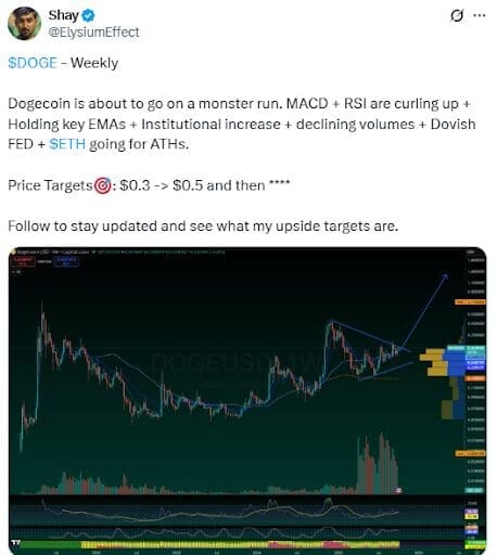 Shay, a crypto analyst on X, believes the Dogecoin price is on track to reach $0.3 and $0.5. Flipping this level could force a breakout above the current high, especially with altseason quickly approaching.
