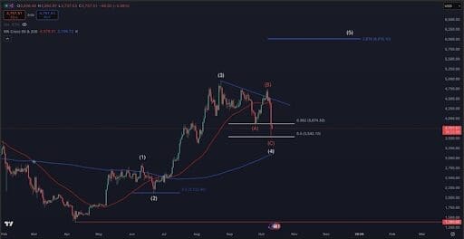 Technical analysis shows Ethereum forming an Elliott Wave pattern of classical five major phases. The current pullback is within wave four, after a strong rally peaked near $4,700. ETH has retraced towards 0.382 Fibonacci at $3,875, but the next significant support is at $3,540, pointing to the 0.5 Fibonacci zone.