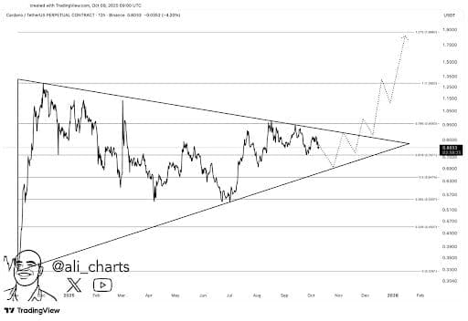 In the recent face of selling pressure, Cardano (ADA) is making encouraging progress, and analysts can indicate a rebound, which can catapult ADA price to a high of $2 in 2026. Technical analysis indicates that today the ADA price is in the midst of a long-term symmetrical triangle, which is frequently a prelude to a bullish breakout.