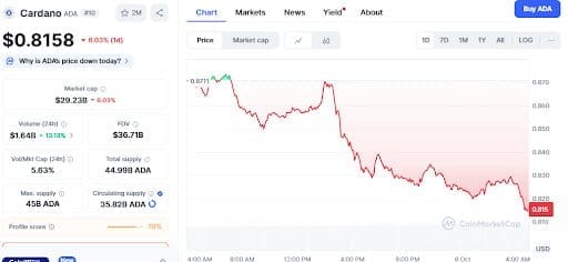 The Cardano crypto maintains the $0.8 support despite recent selling pressure. It nosedived by 6% on the daily chart, although a bounce is on the table. Moreover, its inclusion in the S&P Digital Markets 50 Index is expected to propel prices higher in the future.