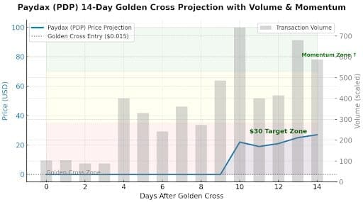 Golden cross formations often mark turning points where markets shift from quiet accumulation to rapid expansion. For Paydax (PDP), the golden cross forming near $0.015 has emerged alongside rising transaction activity and deeper order books — signals that demand is building beneath the surface.