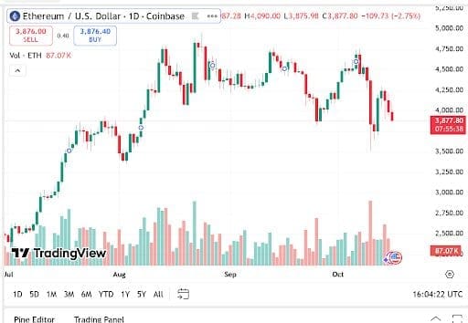 Ethereum (ETH) currently stands at $3,876.00, registering a slight 0.88% decrease in the past 24 hours. Its market capitalization is $488.44 billion, with daily trading volume falling to $43.49 billion, which is a decrease of 27.17%.