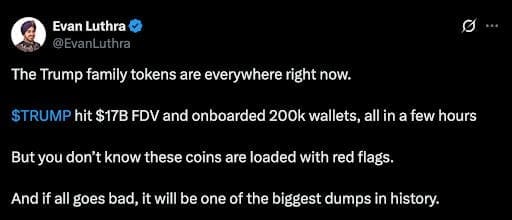 Some now believe that the Trump family’s $1 billion crypto fortune is not so surprising at all. Right after the launch of the TRUMP token in January 2025, venture capitalist Evan Luthra warned that the whole setup reeked of insider timing.