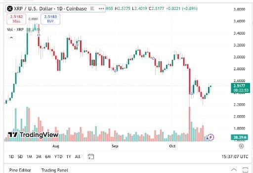 At the time of writing, XRP is currently worth $2.39, which is a drop of 1.12% in the last 24 hours. The market cap is $143.71 billion, and the trading volume over the last 24 hours is $4.8 billion. The rise in volume indicates active repositioning among traders rather than a broad market sell-off.