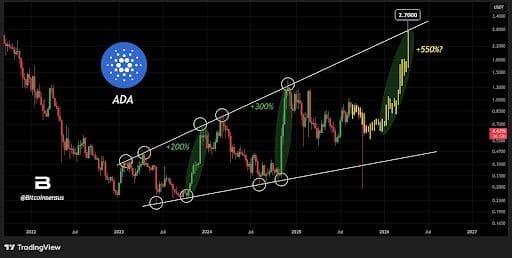 Bitcoinsensus has also mentioned that ADA is moving within a long-term compression channel. A breakout could push Cardano to $2.70 if momentum holds above $0.85.