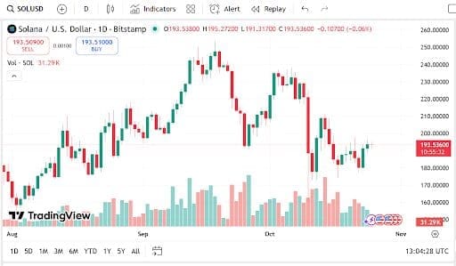 Solana is currently selling at $193.51, following a modest loss of about 0.13% in the last 24 hours with a market capitalization of $106.55 billion.