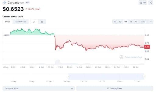 Unlike Solana, the Cardano price is not sporting a positive outlook for the short term. The ADA token lost a $0.80 valuation after the US tariff policy with China crashed the markets, and it has yet to recover, trading at $0.64.