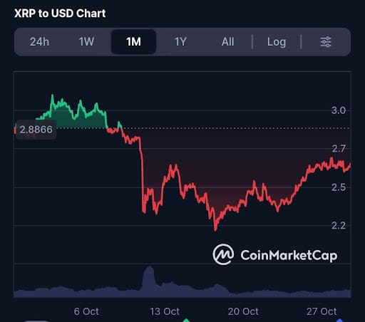 XRP is at the time of press exchanging hands at around $2.60, with an 8% decline in the past month. The dip comes amid recent XRP news where an Indian court stopped XRP from being moved or shared after a $230 million hack.