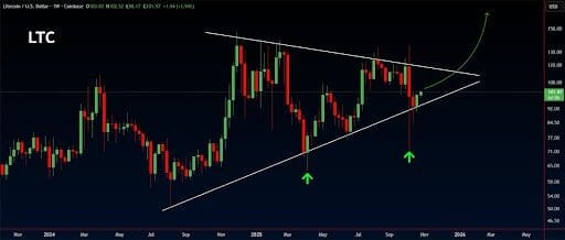 Forecasts for the next cycle show wide but optimistic targets. Many Litecoin price prediction models now suggest the 2025 cycle top could range between $150–$200, depending on Bitcoin’s performance and overall market liquidity. Analysts agree that a daily close above $102 would confirm an uptrend.