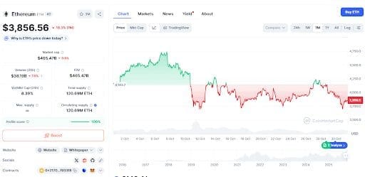 Data from CoinMarketCap indicates that the Ethereum price is struggling to keep the momentum above the key mark of $3,850, with the market sentiment remaining cautious after failing to breach $4,000 on several occasions.