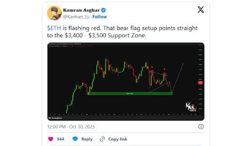 $ETH is flashing red. That bear flag setup points straight to the $3,400 – $3,500 Support Zone. pic.twitter.com/jRwndRpUvl