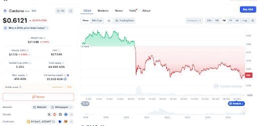According to CoinMarketCap, the Cardano price is still trading in the red zone. From a price structure standpoint, the ADA price is still stuck in a sideways consolidation phase after falling sharply earlier in October.