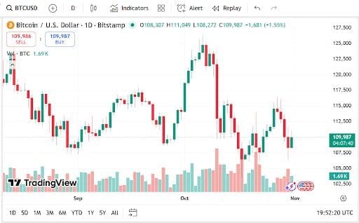 With a market valuation of $2.17 trillion, Bitcoin is still the preferred reserve asset. It has increased by 1.95% in the last day to $109,986. As big wallets continue to accumulate, trading volumes, which are down 11.29% to $66.34 billion, suggest a consolidation phase rather than a decline.