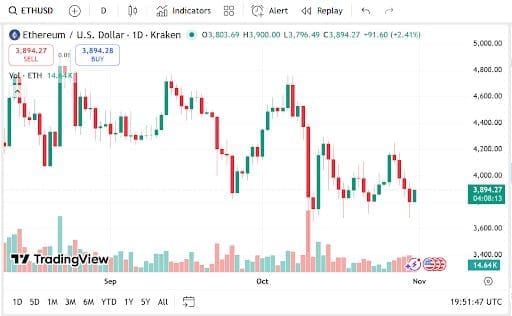 In contrast, Ethereum has had consistent purchasing pressure and is currently up 2.29% in a single day at $3,894.27.