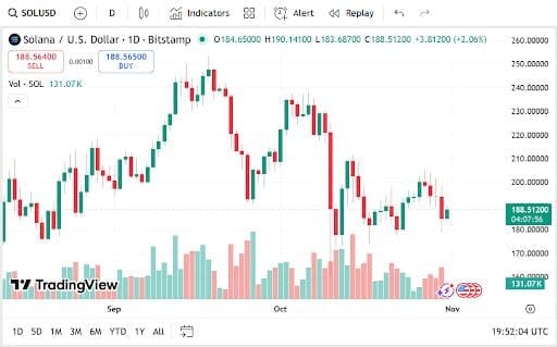 At $188.56, Solana is up 0.7% and has a market capitalization of $102.79 billion. Even if its 24-hour trade volume has decreased by 28.67% to $6.86 billion, on-chain activity is still robust due to new ecosystem collaborations and consistent developer participation.