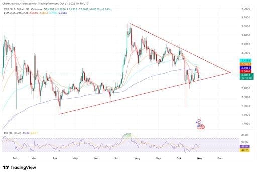 Nevertheless, the XRP price outlook is rather optimistic. However, traders are monitoring the range of $2.35-$2.75, expecting to see a possible breakout. Technical patterns show consolidation within a narrowing triangle. But fading whale participation suggests limited near-term momentum.
