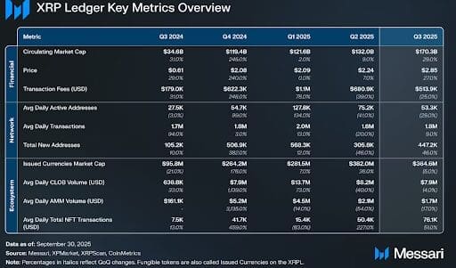 The XRP Ledger (XRPL) has seen steady growth in network activity throughout the third quarter of 2025. The latest report shows that all major indicators are increasing, driven by growing user engagement and developer activity. The latest numbers show a 9% increase in daily transactions quarter over quarter, totaling 1.8 million. Daily sender addresses increased by 15%, while over 447,000 new addresses joined the network, totaling over 6.9 million.