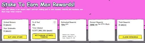 $MAXI holders have the option to stake their tokens and earn staking rewards. At the moment, the APY stands at 78%, increasing as more tokens are added to the staking pool. Over 9.5 billion tokens have been staked so far.