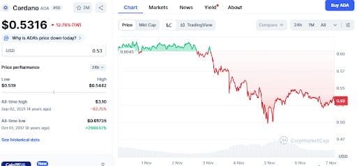 Ali, a leading expert with over 160,000 followers on X, believes the bottom may be in for the Cardano coin. Following a 12% downturn this week, ADA hovers around $0.53. Even more concerning is the slip from its monthly high of $0.84.