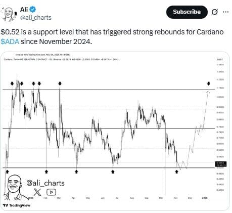 $0.52 is a support level that has triggered strong rebounds for Cardano $ADA since November 2024. pic.twitter.com/8HdaiayxYO