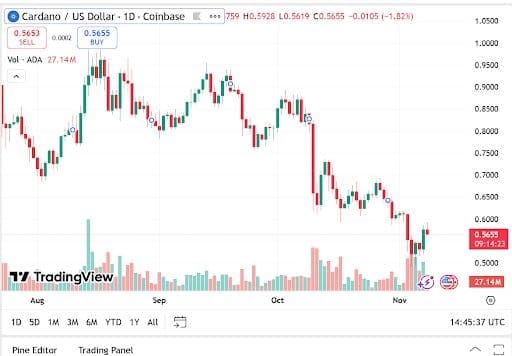 At press time, Cardano trades at $0.5587, up 0.37% in the last 24 hours, giving it a market cap of $20.65 billion with a trading volume of $1.28 billion, up 6.89%. This steady recovery follows a period of consolidation during which ADA maintained strong on-chain staking and developer activity.