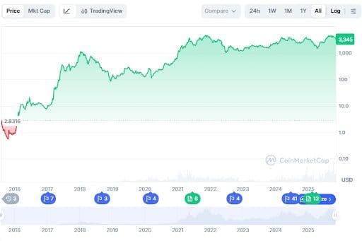 Ethereum’s price stands at $3,345, down by 1.16% in the past 24 hours (at the time of writing). This price decline can be attributed to security fears, as AI-driven malware attacks have been targeting ETH wallets, technical breakdown, and market-wide caution. The price has also decreased by 13.03% over the past week and by 25.7% over the past month.