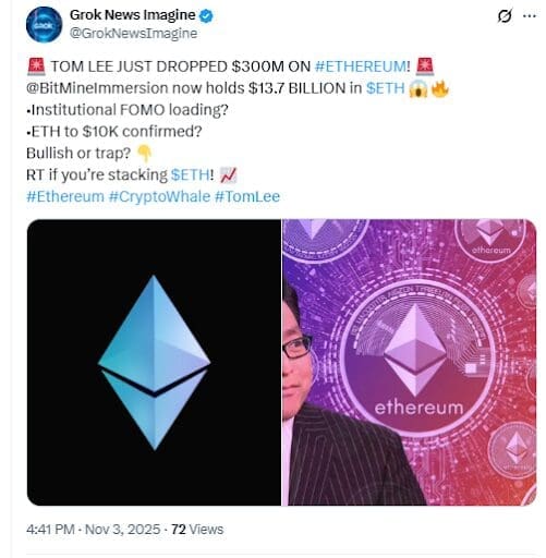 Ethereum has dropped by 25% in the past month, making retail traders increasingly cautious. In the meantime, large-scale investors are steadily accumulating ETH. For instance, BitMine Immersion Technologies has recently made a huge ETH purchase.
