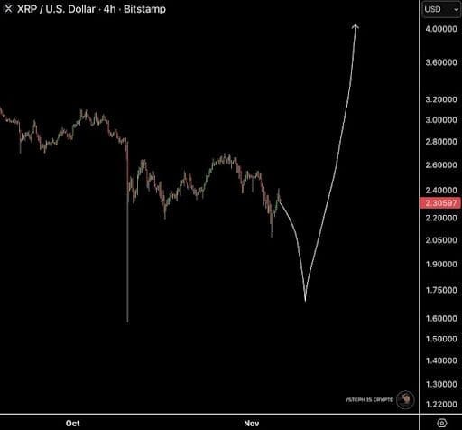 Analyst STEPHISCRYPTO shared a chart on November 8, 2025, outlining XRP’s worst-case path. The visual maps consolidation near $2.30, followed by a slide to $1.60 support over the next week. From there, a reversal kicks in, targeting $4 by early 2026 if momentum rebuilds. This setup factors in whale sales and ETF hype fading post-launch.
