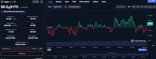 As one of the most popular meme coins on the market, Pepe coin is finally in an uptrend after a month of constant losses. The token has gained nearly 1.5% over the past day, and although small, it is a signal of potential price recovery.